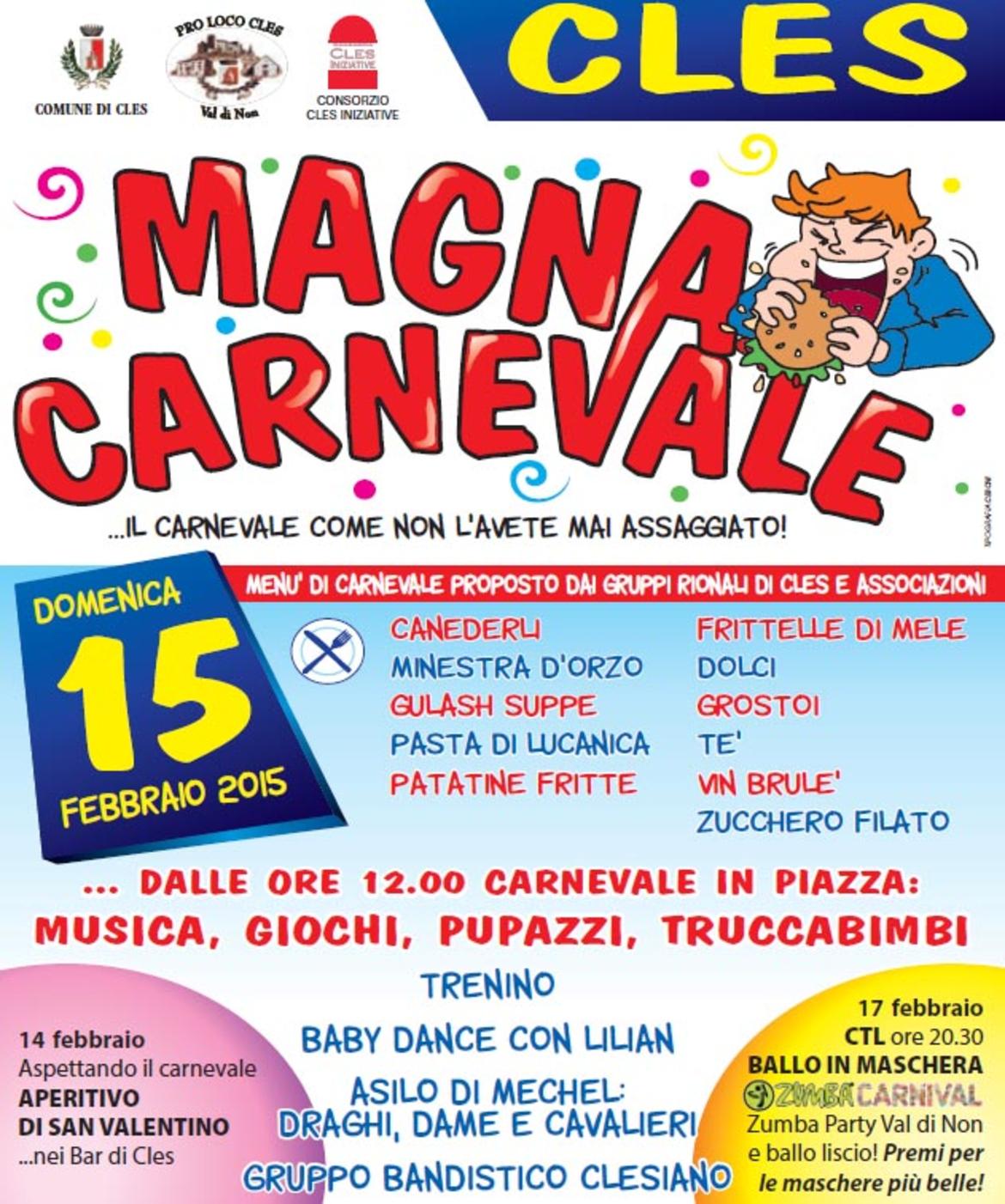 Menù di carnevale proposto dai gruppi rionali di Cles con: canederli, minestra d'orzo, Gulash Suppe, Hamburger, patatine fritte, gorstoi, frittelle di mele, dolci, thè, brulè, zucchero filato